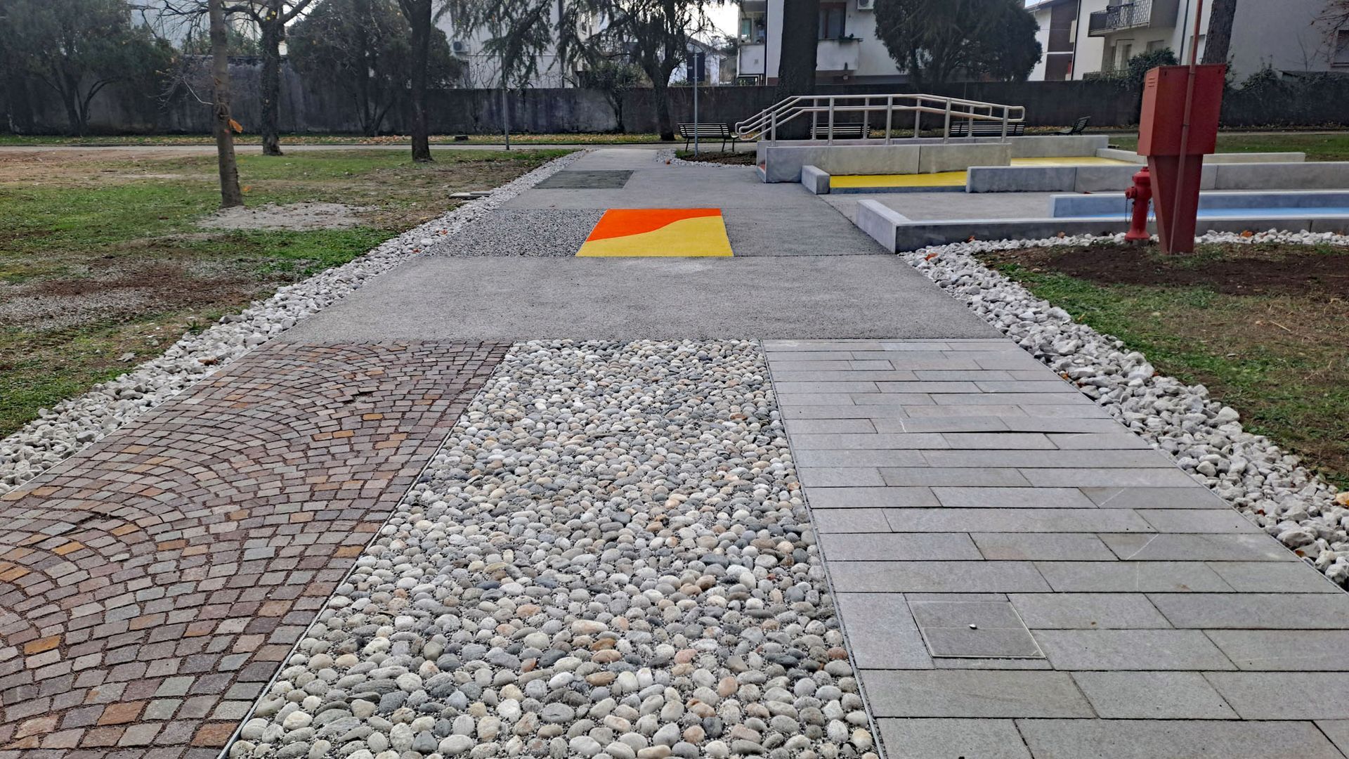 percorso rettilineo in piano e a raso, caratterizzato da una pavimentazione in con finitura colorata con ossidi in tinta verde.