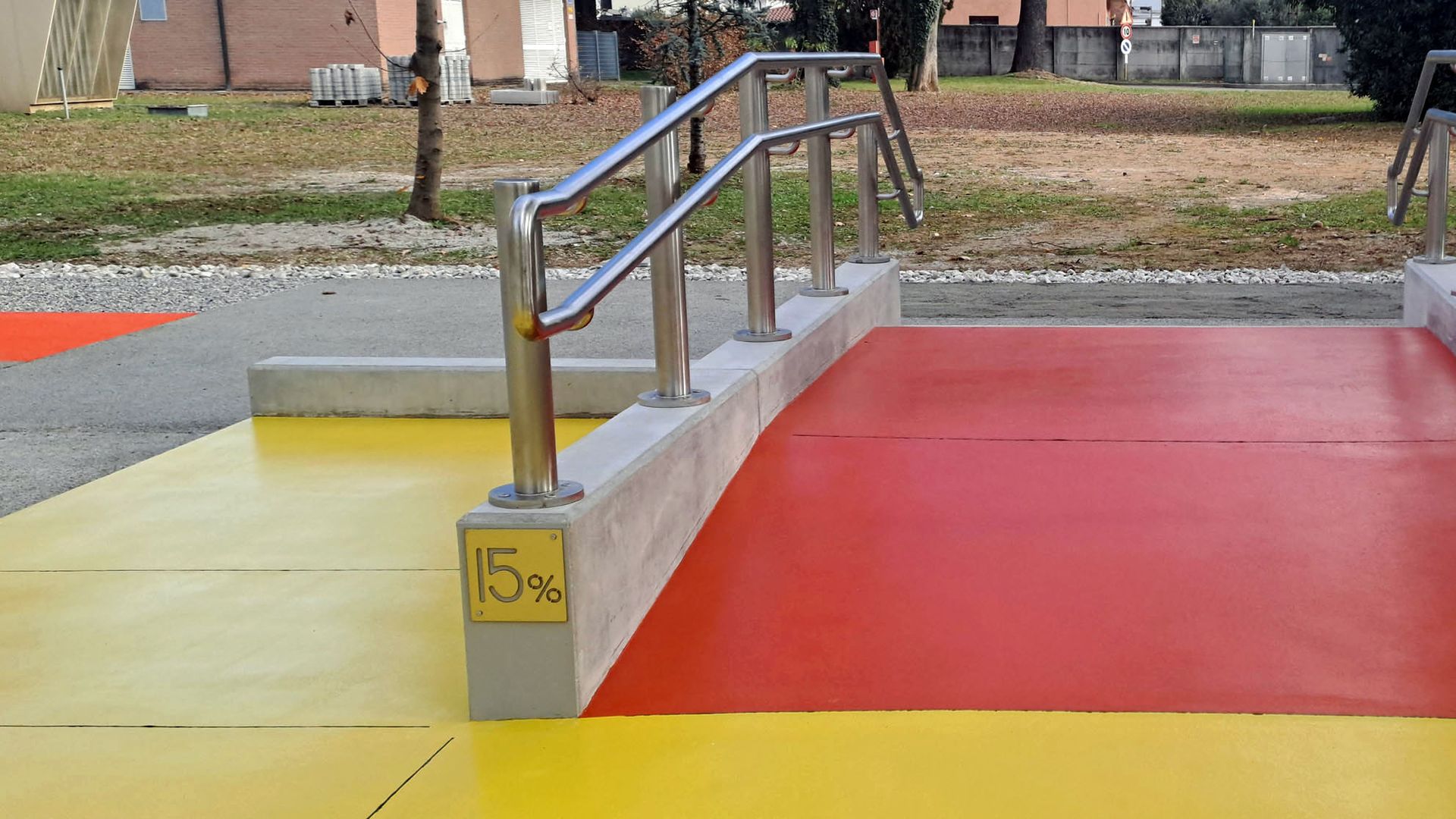 - Rampa breve di raccordo con pendenza longitudinale del 15%, caratterizzata da una pavimentazione in calcestruzzo armato con finitura al quarzo colorata con ossidi in tinta rossa. La rampa, attrezzata su entrambi i lati con un doppio corrimano, termina con un pianerottolo dal quale si affronta la “scala di tre gradini”.
