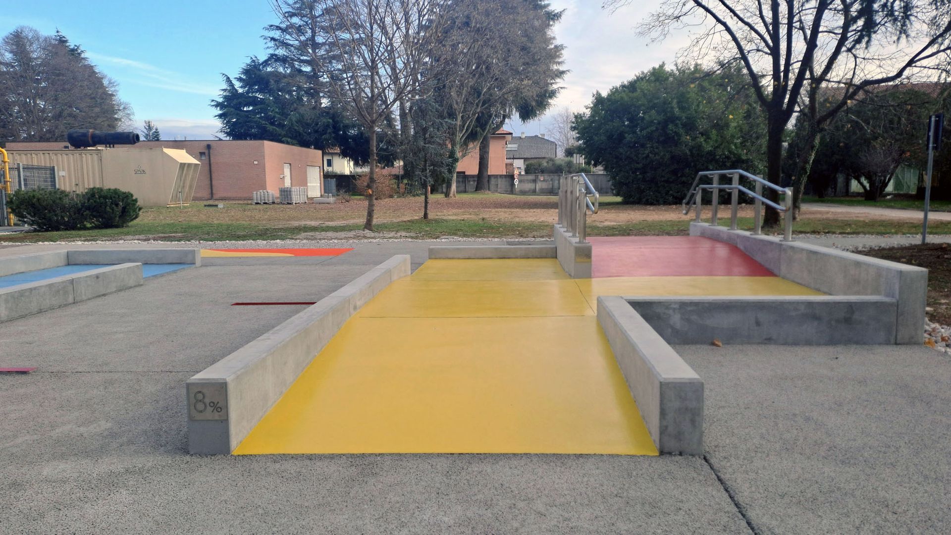 - Rampa breve di raccordo con pendenza longitudinale dell’ 8%, caratterizzata da una pavimentazione in calcestruzzo con finitura al quarzo colorata con ossidi in tinta gialla. La rampa termina con un pianerottolo dal quale, con rampa in discesa con pendenza longitudinale dell’ 8%, si raggiunge il “dislivello 10 cm” oppure si passa alla “rampa con pendenza 15%”.